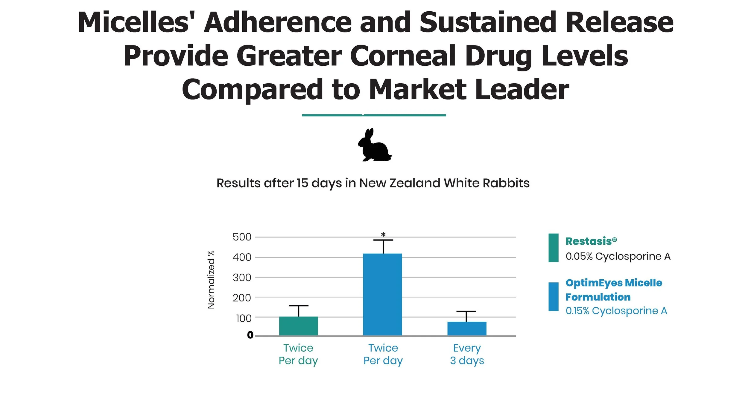 The Micelle Formulation dosed once every three days has statistically similar levels of Cyclosporine A in the cornea as Restasis dosed twice daily. When the Micelle Formulation is dosed twice daily like Restasis, over 4x more drug penetrates into the corneal tissue.