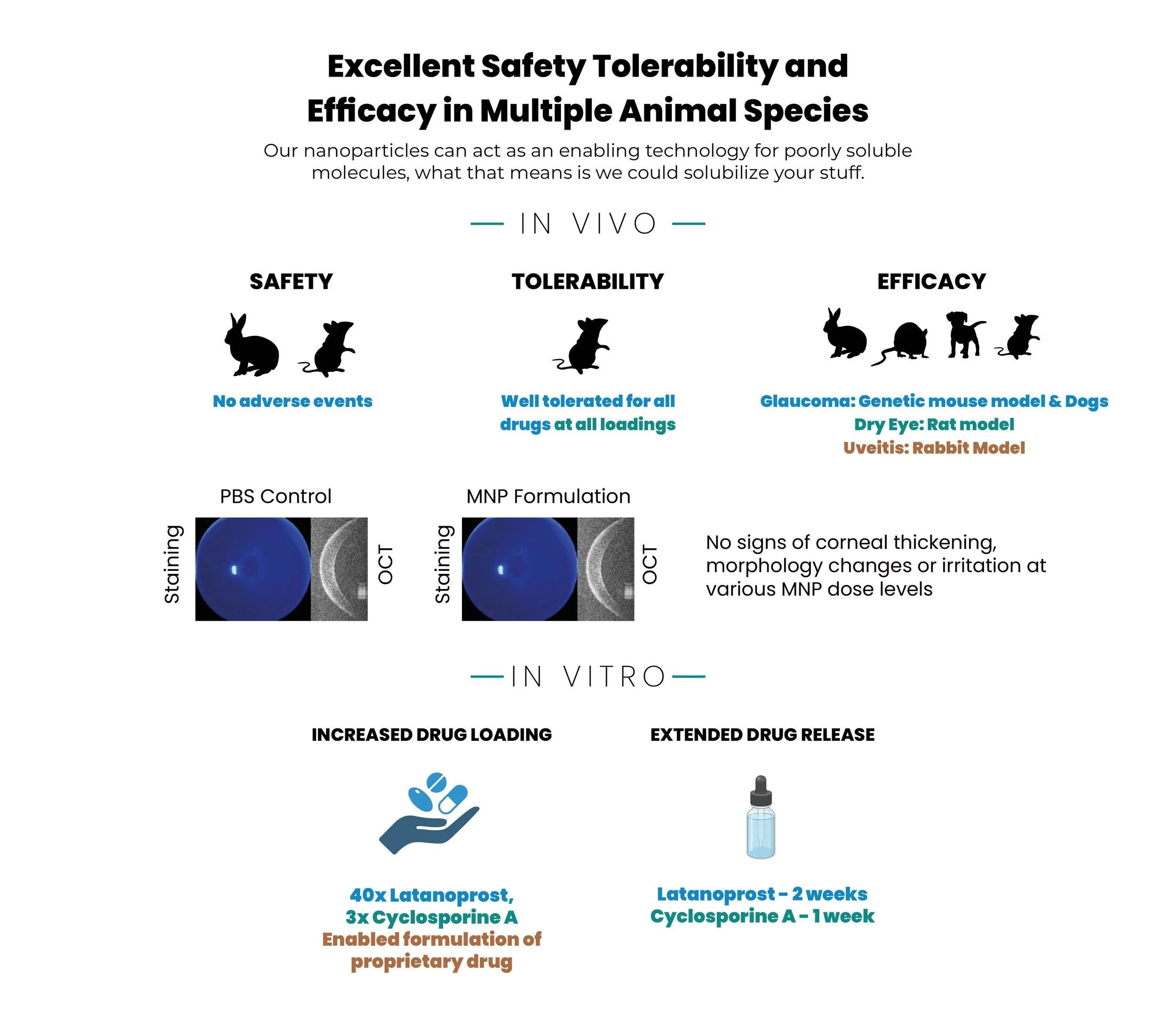 Our technology has applicability in a range of ocular conditions and other diseases affecting mucosal areas. These diseases affect a significant number of Ontarians, and their impacts will be even more pronounced with an aging population. We aim to improve the treatment for these patients by combining our delivery technology with our partners' therapeutic compounds. The patented micelle formulation will be modified to incorporate and release these compounds, while maintaining the mucoadhesive properties of our micelles.